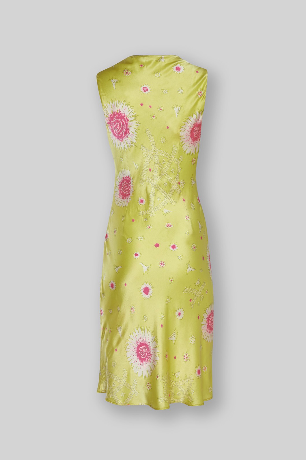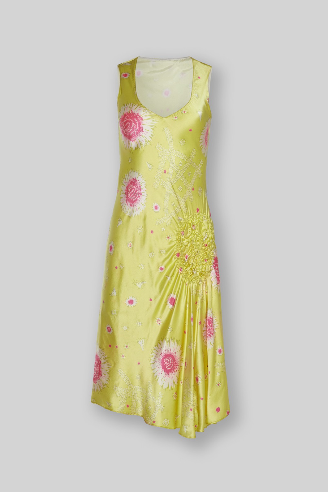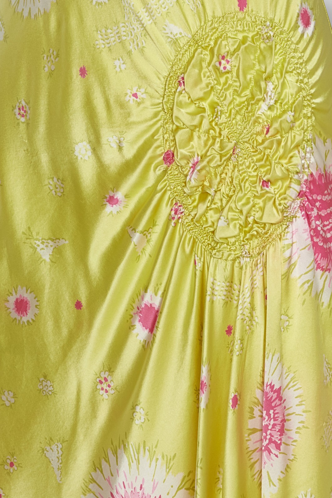 Dress, yellow silk satin with pink and white flowers printed, smocking part in the waist
