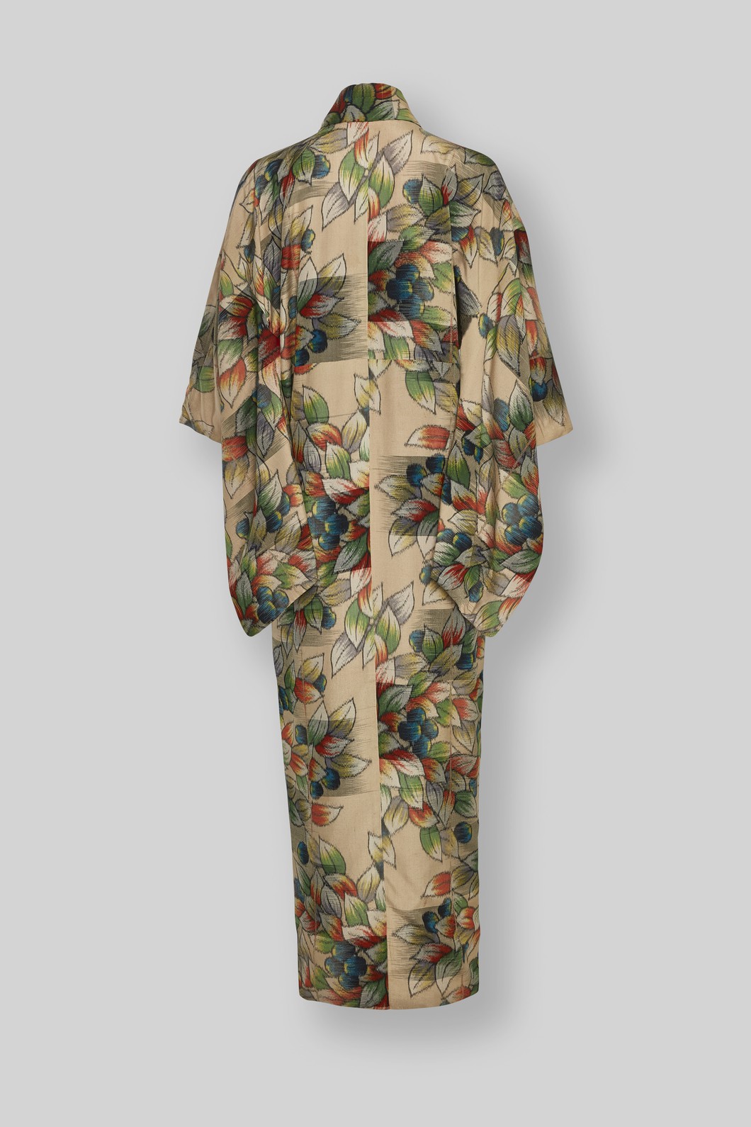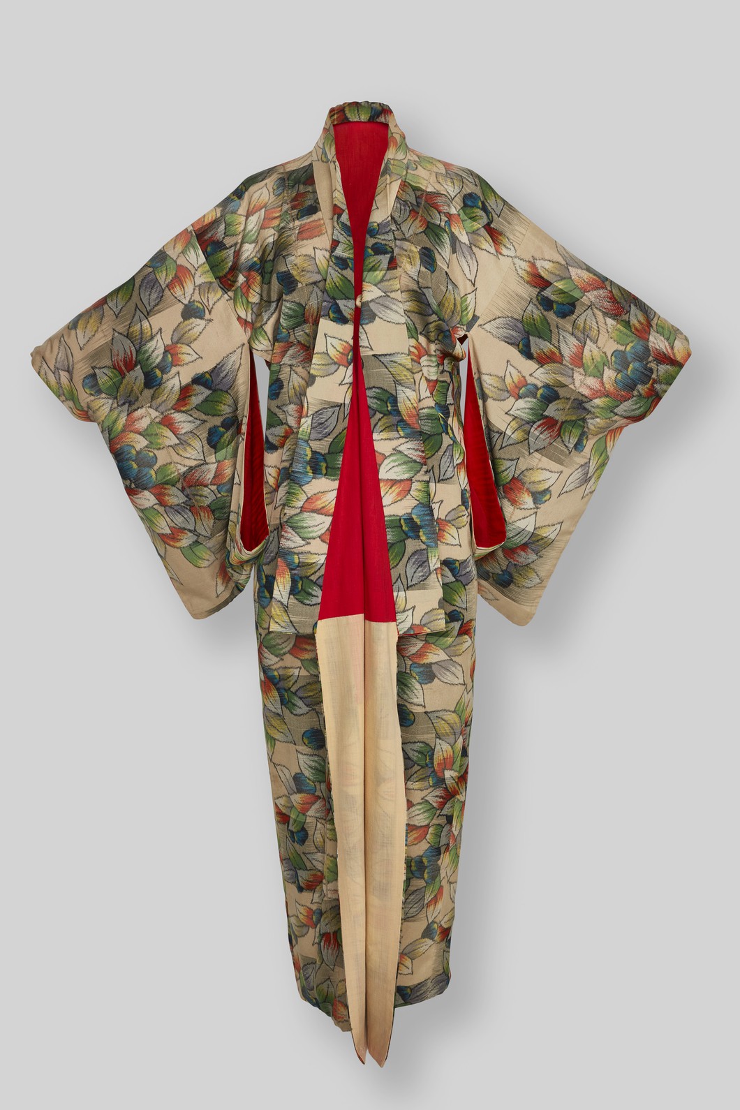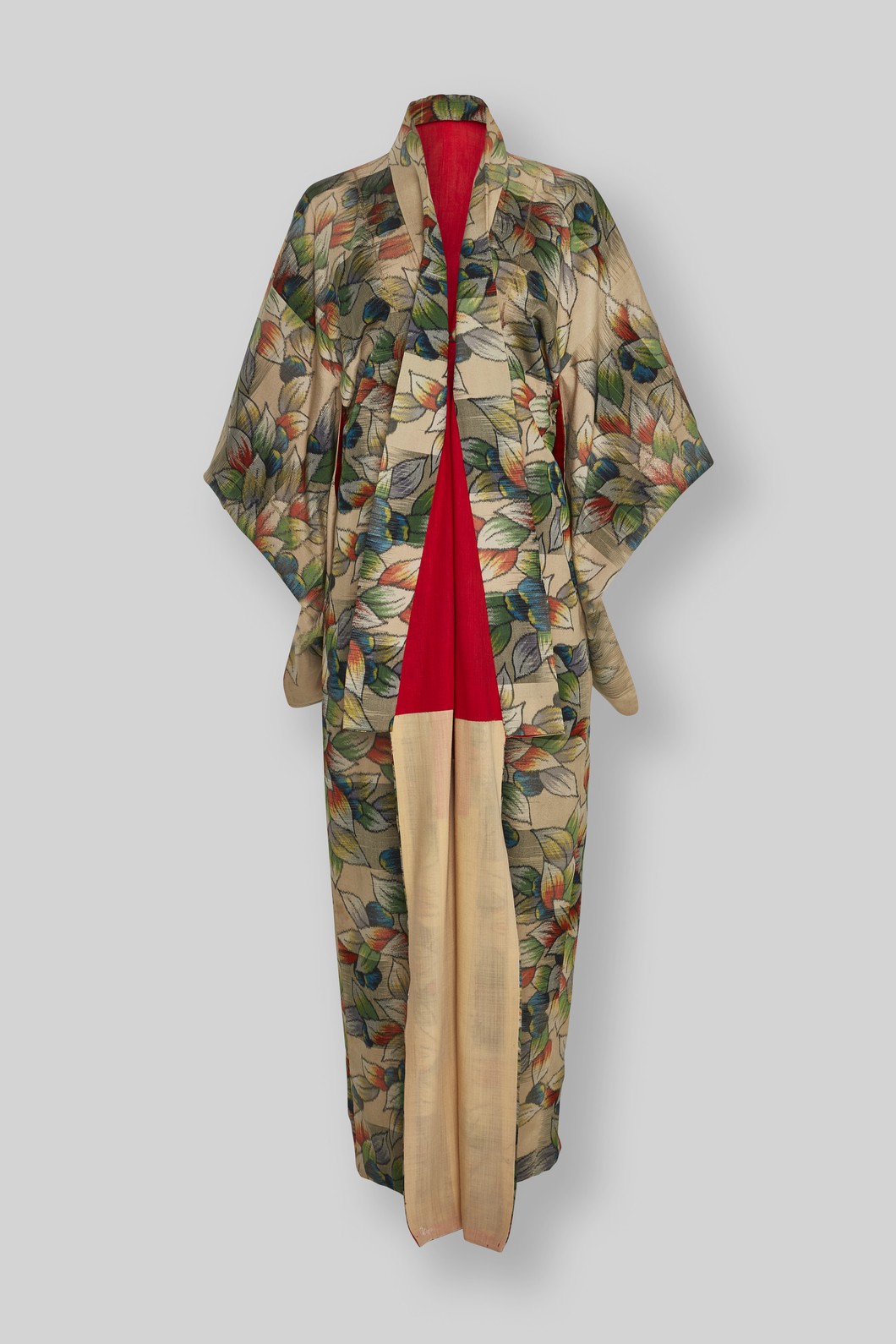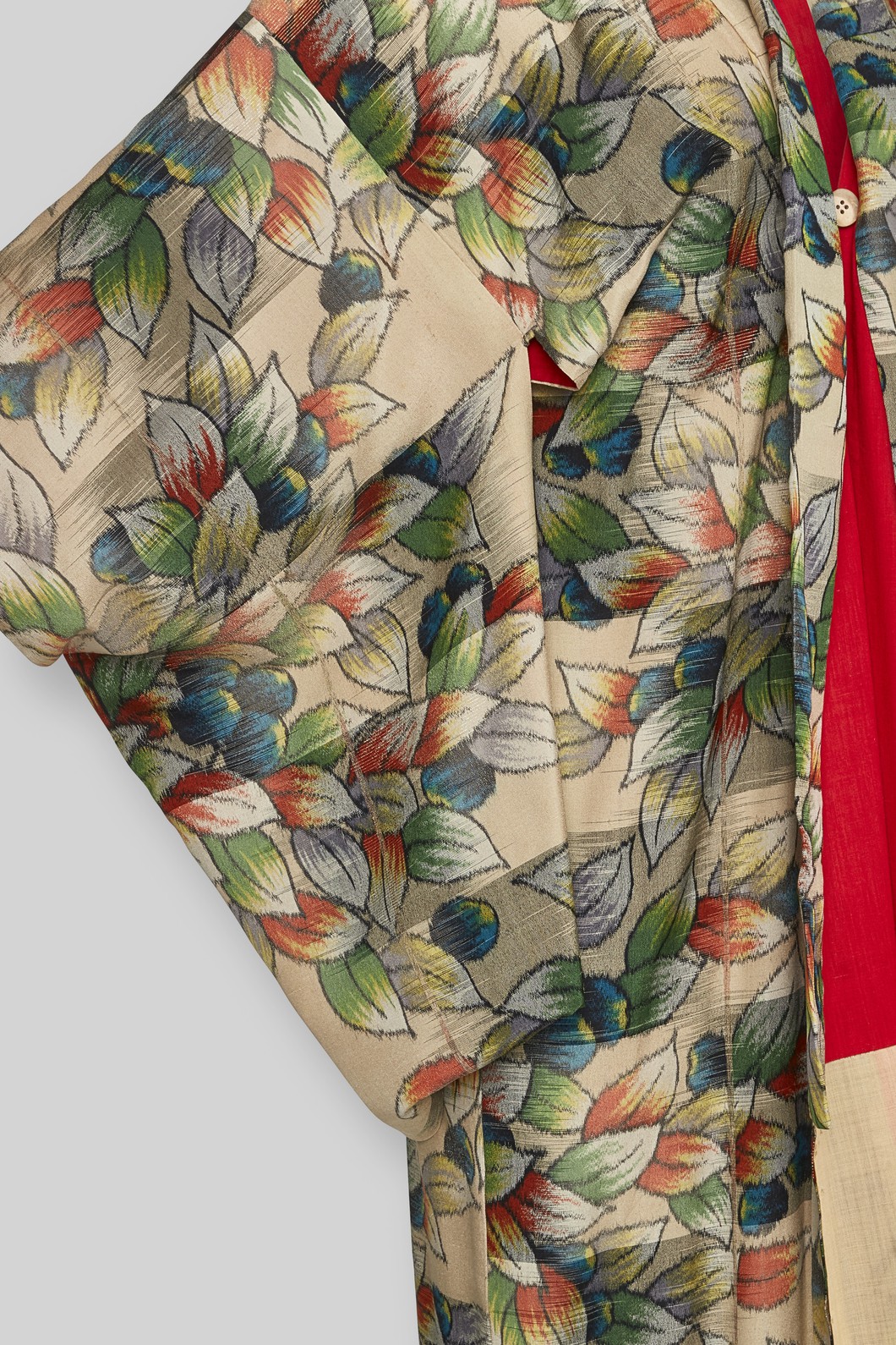 Kimono, beige mit farbigem Ikatdessin und roten Aufschlägen