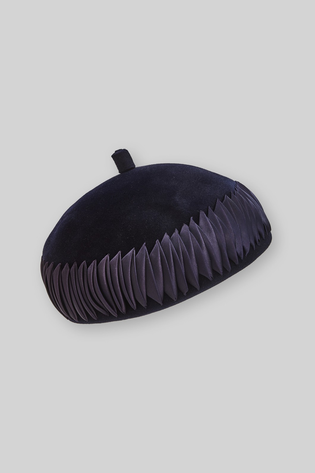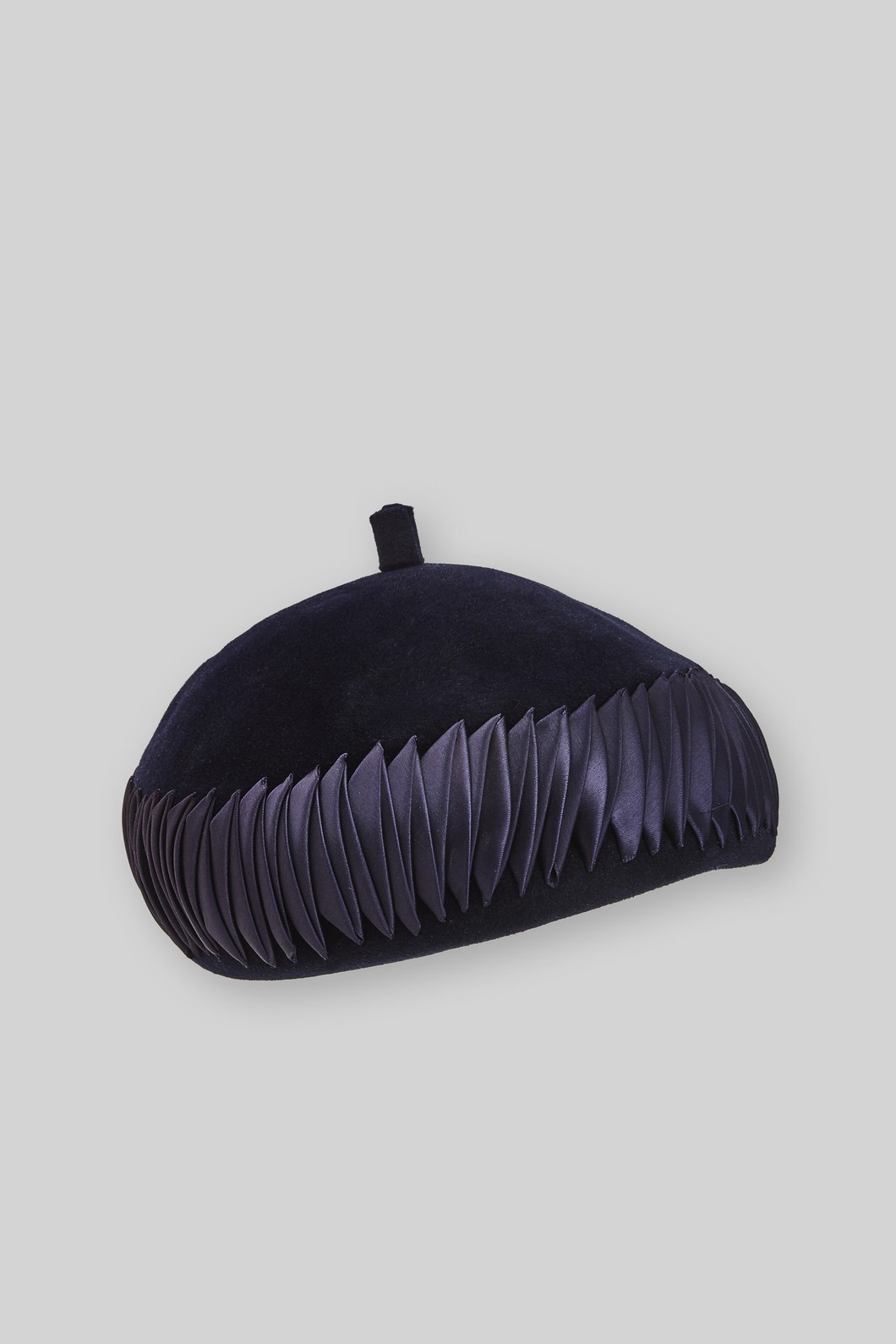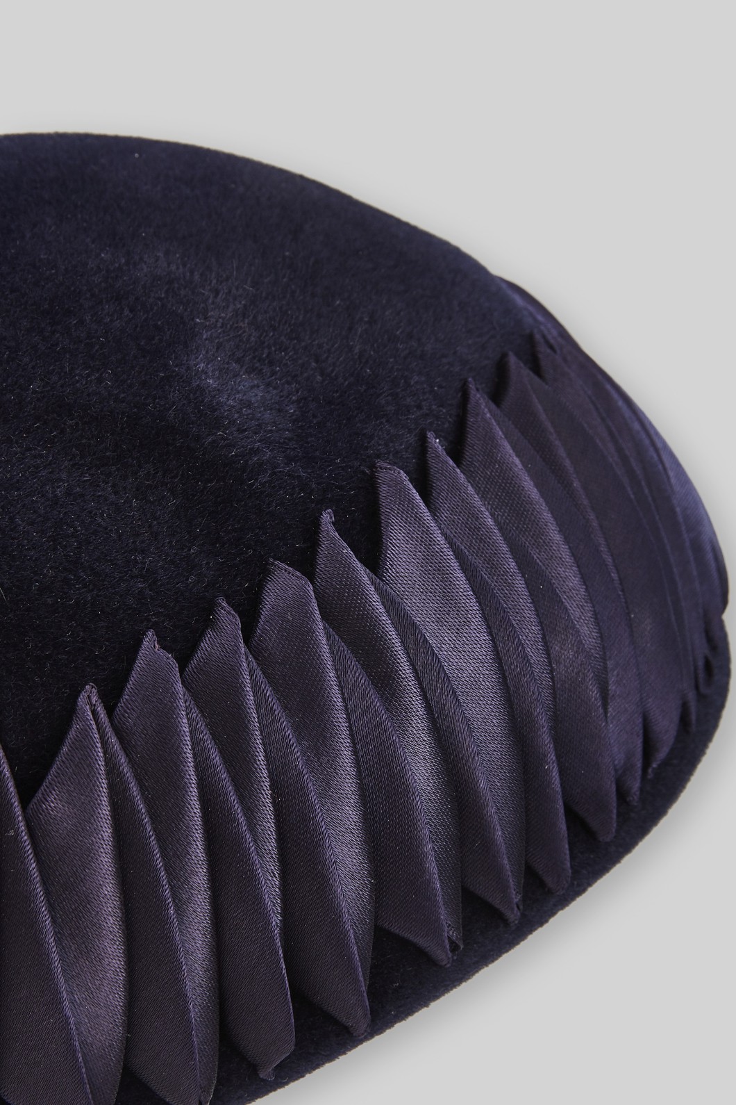 Kappe, Pillboxform, blau, Wollfilz, Satinband in Falten gelegt