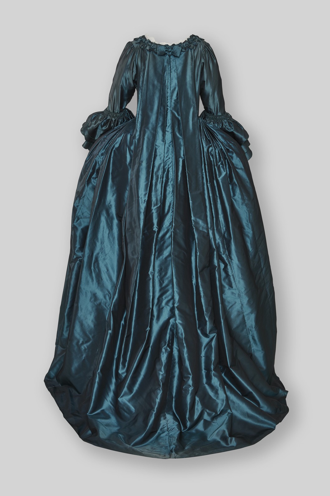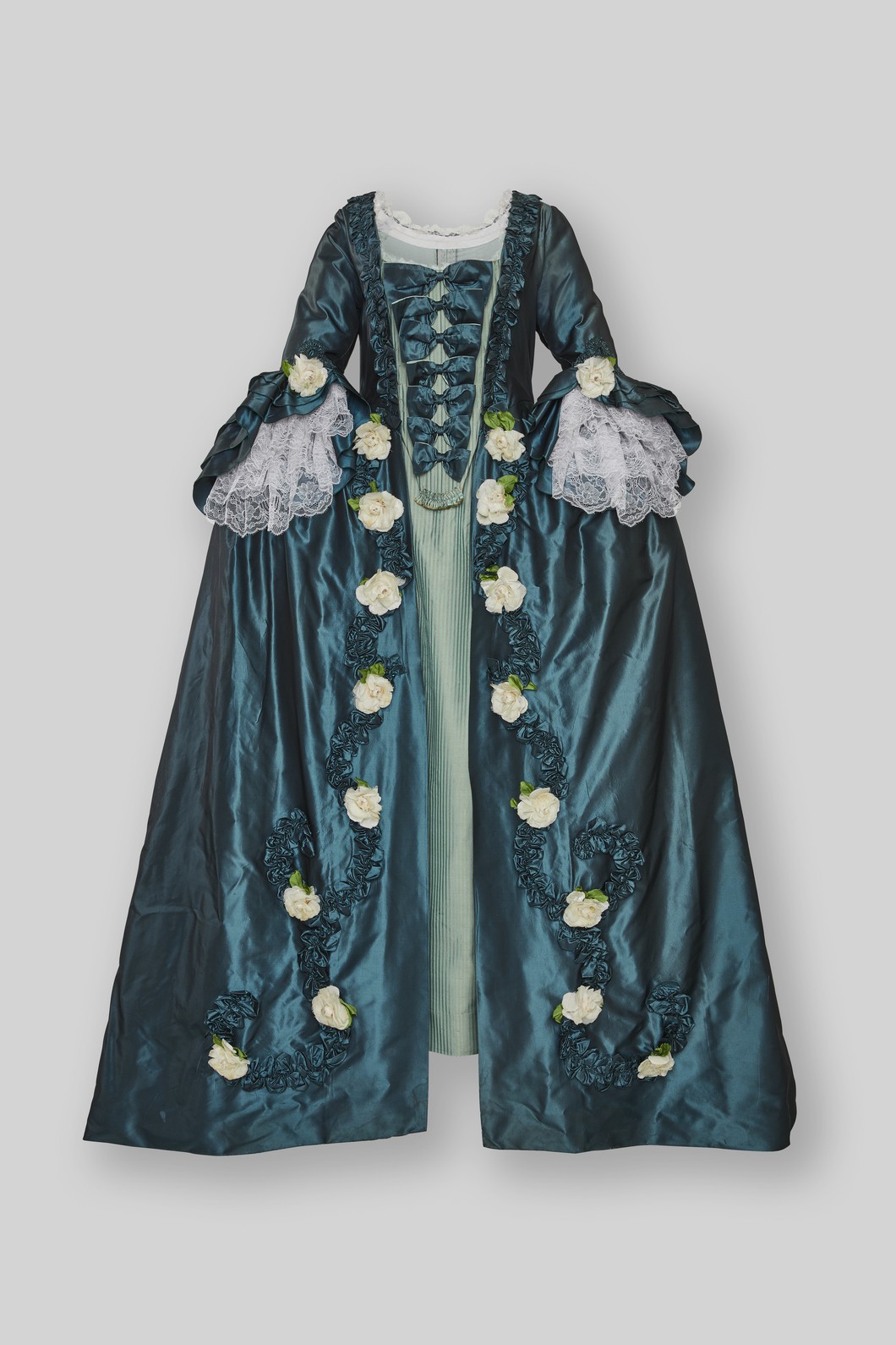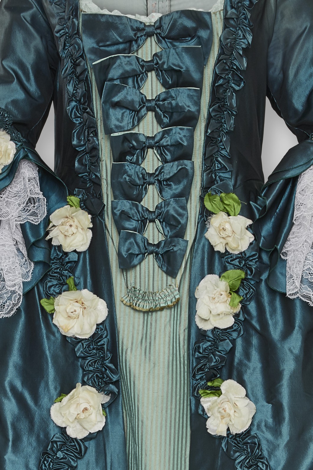 Robe à la Francaise, Manteau und Stecker, petrol, Seidentaft Changeant, mit Seidenblüten, Rüschen und Schleifen geschmückt; Unterrock, türkis-beige gestreifter Seidensatin