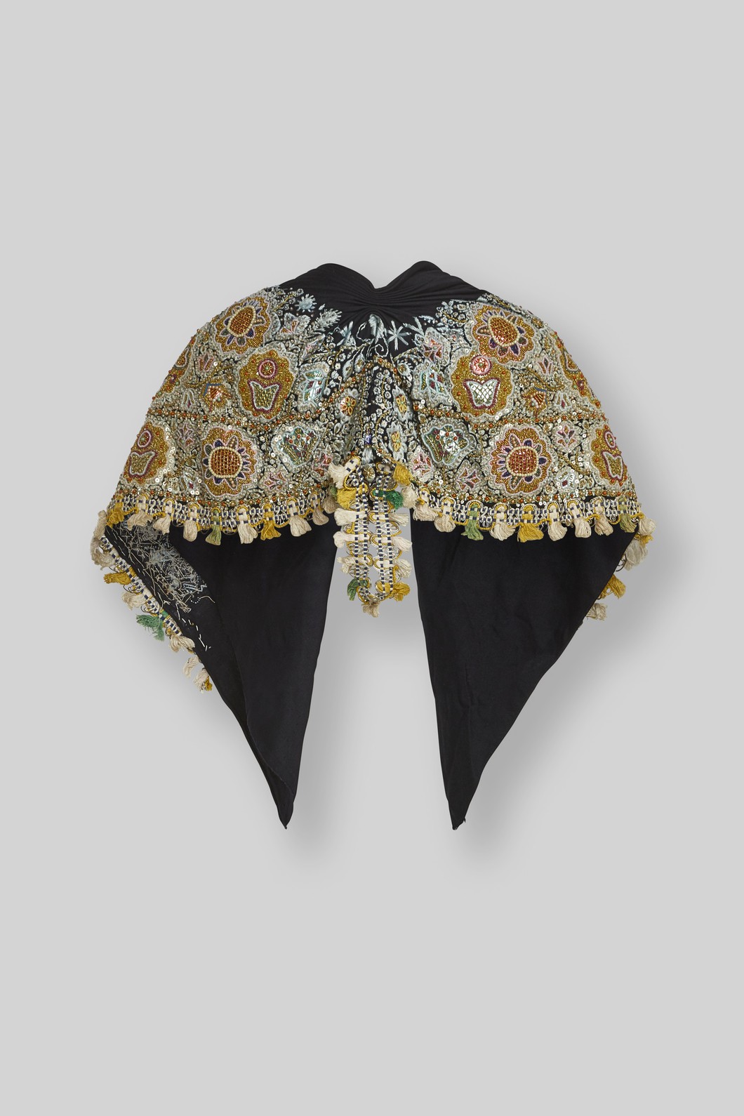 Cape, schwarz, aufwendig farbig bestickt mit Perlen und Fransen