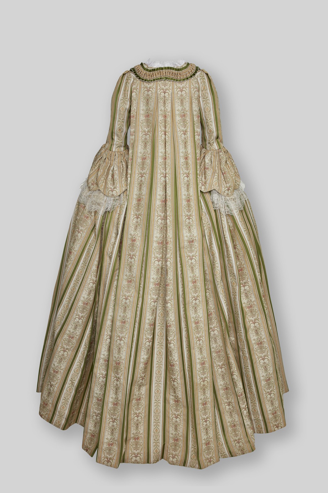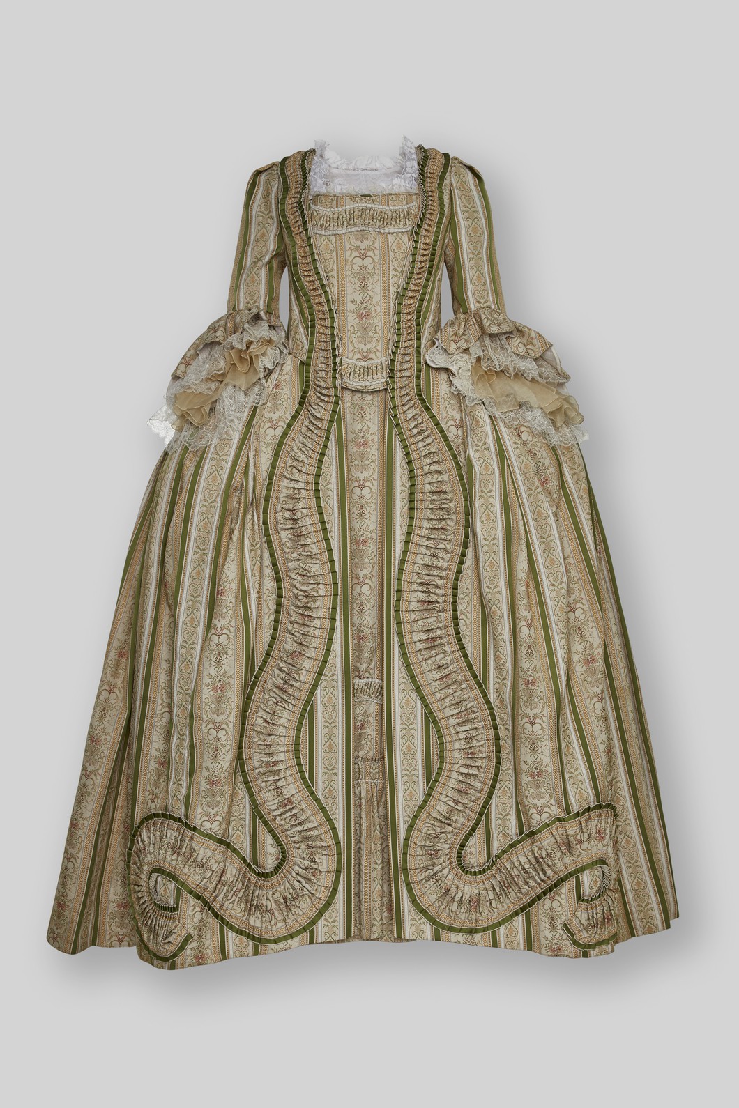Robe à la Francaise, Manteau, Stecker und Rock, beige, oliv, altrosé gemusterter Jacquard mit olivgrünen Streifen